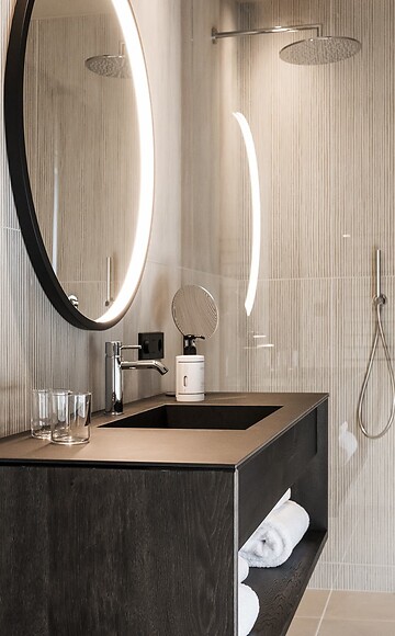 Eine wie keine! Die Rosengarten Grand Suite ist die Perle im Boutique Hotel Eisenhut, luxuriös bis ins kleinste Detail, ohne dabei dem Naturflair die Show zu stehlen. Sie erstreckt sich über zwei Stockwerke, die mit edlen Hölzern, natürlicher Lehmverputze und warmen Stoffen ausgestattet sind. Erwachen Sie mit Blick auf den Rosengarten im Morgenlicht, ziehen Sie sich wann immer Sie möchten in Ihre private Sauna zurück und lassen Sie den Urlaubstag am knisternden Feuer auf Ihrer Terrasse ausklingen. Wer das Exklusive und Elegante sucht, ist hier genau richtig, egal, ob als Paar, „Doppel-Paar“, Familie oder mit Freunden!